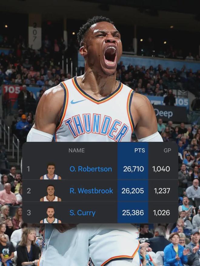 据统计,威少距离历史控卫得分王仅差505分,给人家一个赛季的时间,完全可以实现登顶。